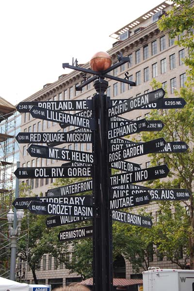 A standard street sign has a known function and simple premises and affordances. It is intended to provide context within a given city. The example above, while providing some local context, is meant to set the reader within a global context. It is not "usable", but it does provide a function.