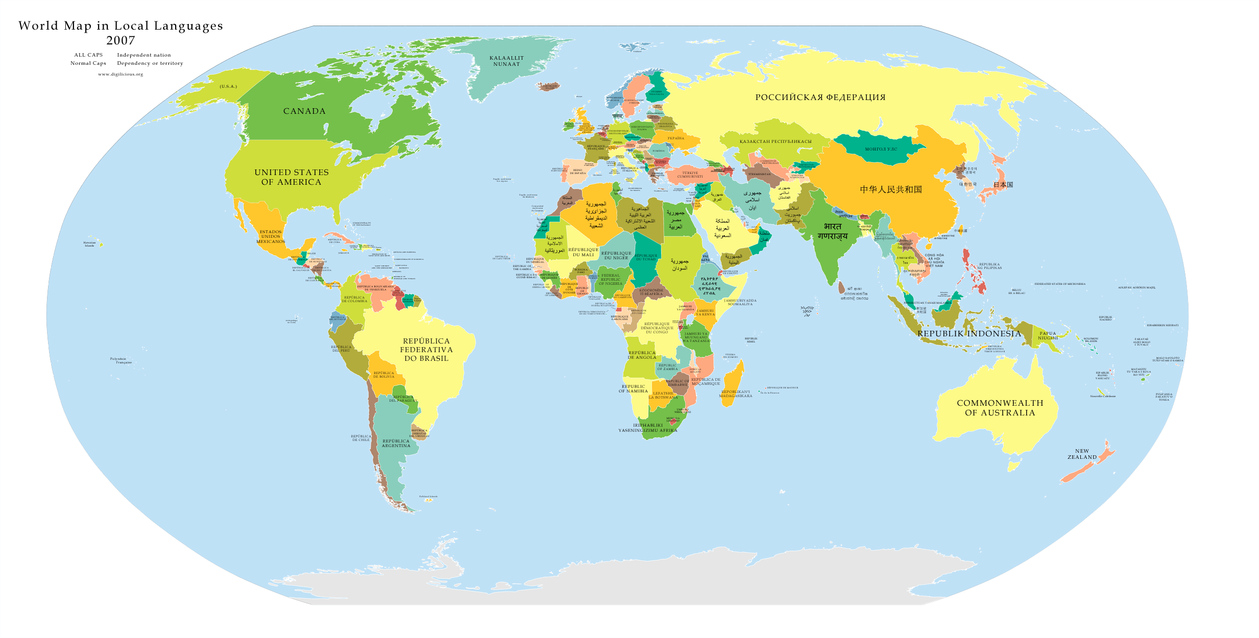 Although many countries have more than one official language, a design decision was made to limit each country to one name. The general rule was to use the official language with the highest percentage of regular speakers, though there are several exceptions. In cases where an official language appears largely governmental, and is not spoken by the vast majority of citizens, an unofficial majority language was used. However, in places with many languages where there is no clear majority tongue, I defaulted back to the official language. This was particularly prevalent in Africa, with hundreds of different languages and mutually unintelligible dialects. English and French are common official languages, although not necessarily spoken by many natives.