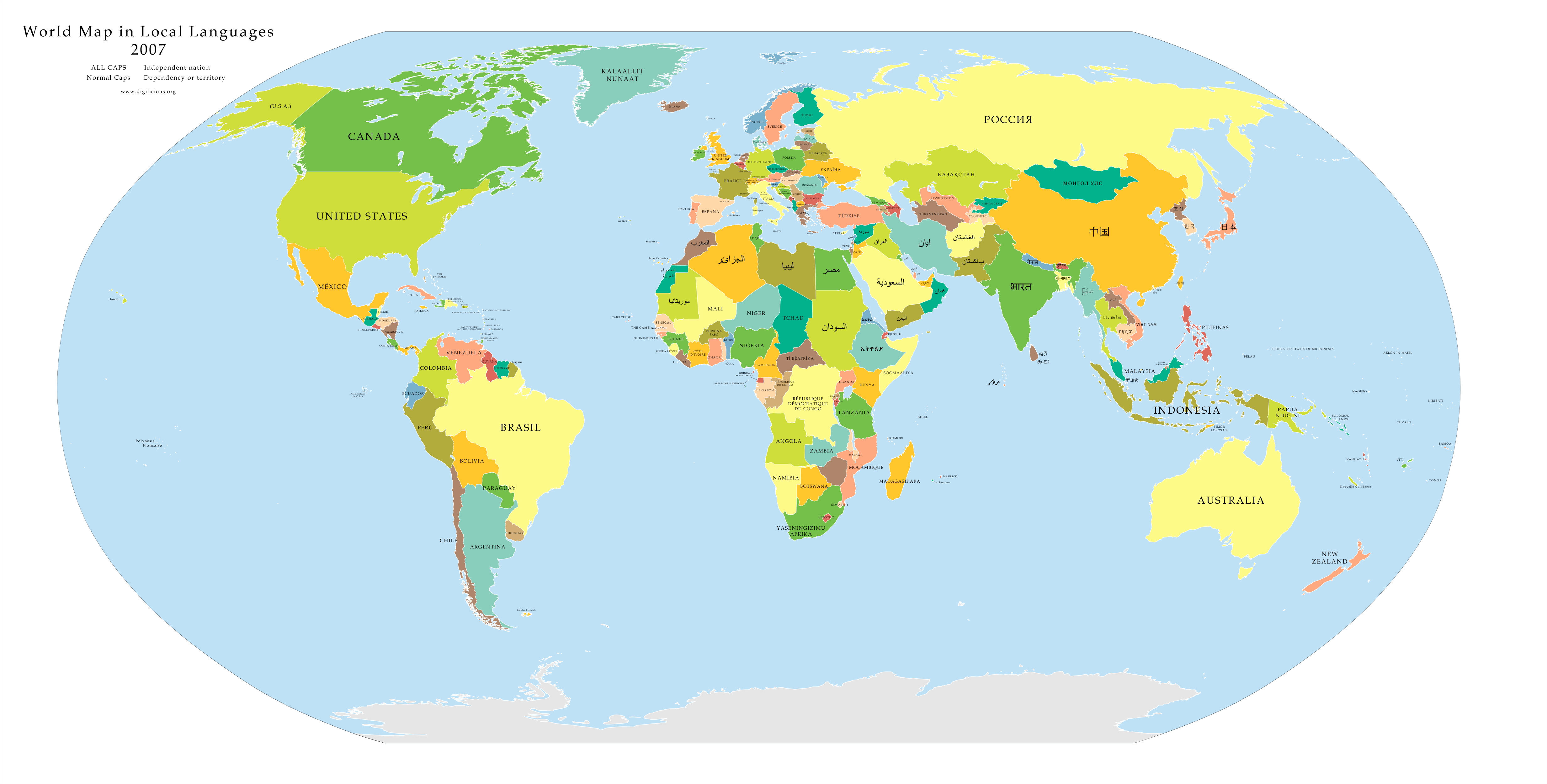 Aside from their geographical limitations, most maps have a huge linguistic bias. A world map represents a global consensus of political and geographical boundaries which everyone can recognize, but none of them (that I could find) represent a linguistic consensus--i.e., country names as written by their own residents. This was an attempt to create a written map that is equally useful (or unuseful, as the case may be) for everyone. Anyone, anywhere in the world can say, "This is my country, and my country's name."